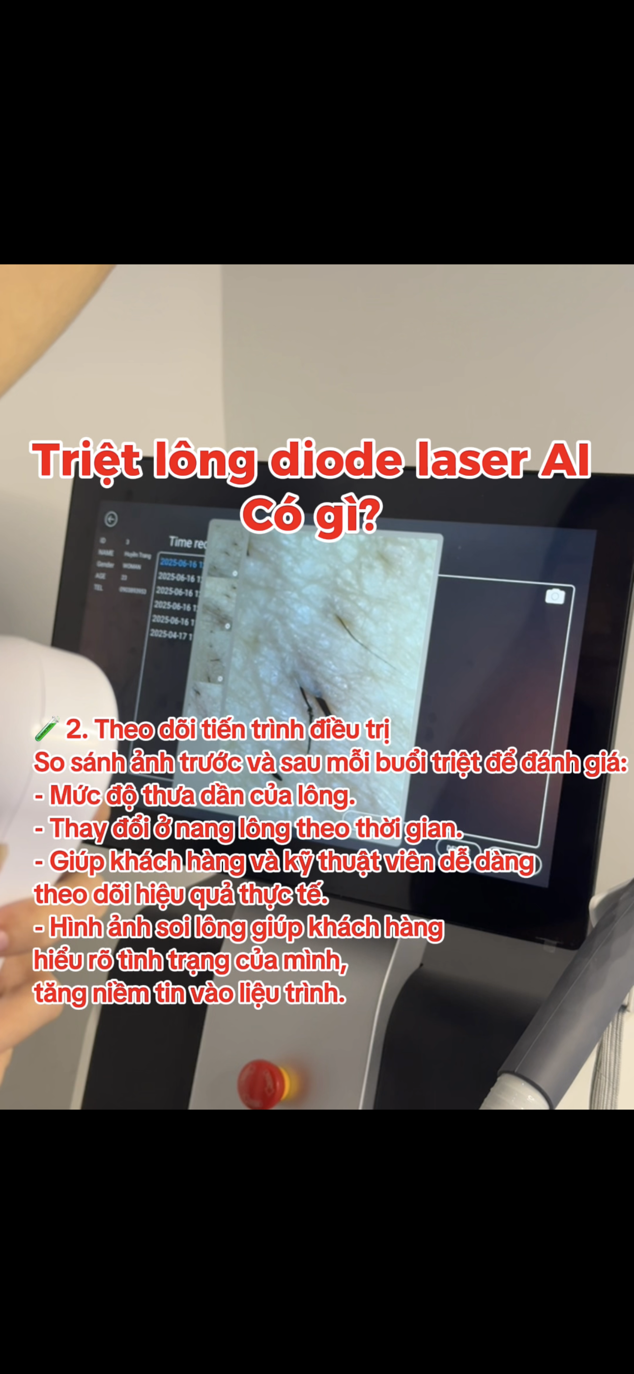 🔍 Có máy soi lông chuyên dụng, kiểm tra kỹ trước và sau triệt → theo dõi hiệu quả rõ ràng